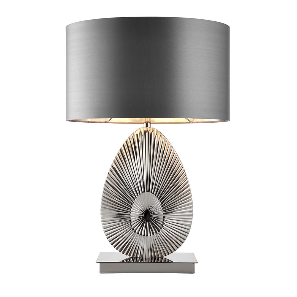 The nickel plate finish of this detailed table lamp has decorative lines growing out from the centre of the oval base, that sits upon a rectangle plate and under a grey satin oval shade. Suitable for use with LED lamps and supplied with inline switch