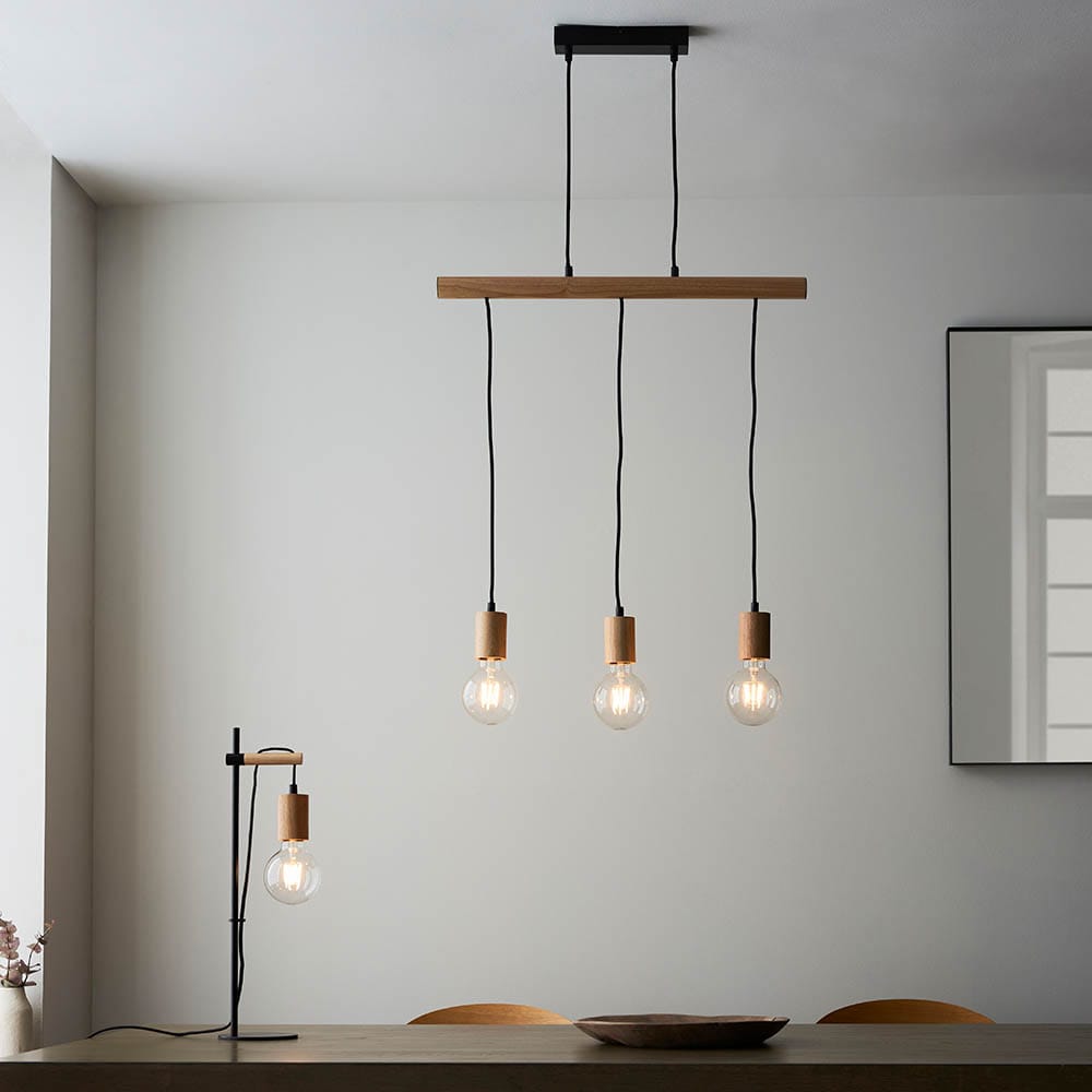 A three light linear pendant bringing the outdoors in, with natural light wood and matt black wood framing elegant filament lamps.