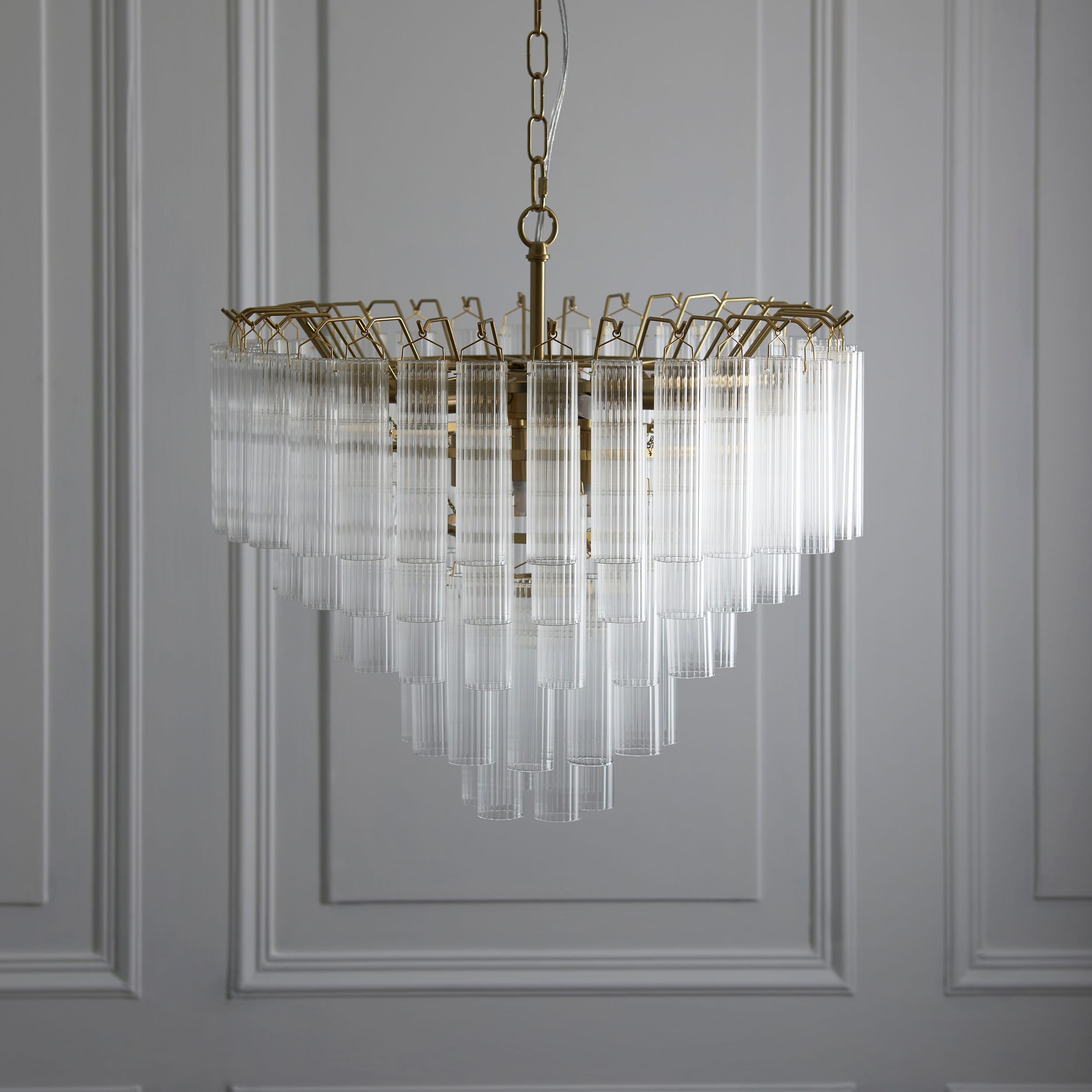 Show stopping tiered tubular glass chandelier with fine ribbed cylindrical clear glass set amongst satin brushed gold plated metalwork. A stunning focal piece to light up an interior space with grandeur.