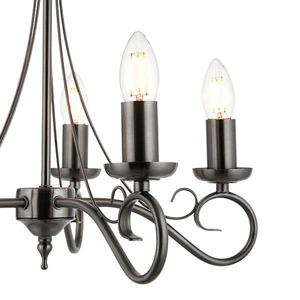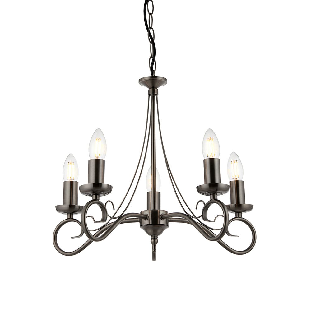 The Trafford pendant is a 5 light ceiling fitting which has an adjustable drop and can also be converted to a semi flush fitting. Finished in antique silver effect, this fitting is also suitable for use with LED lamps. Other options and finish also available