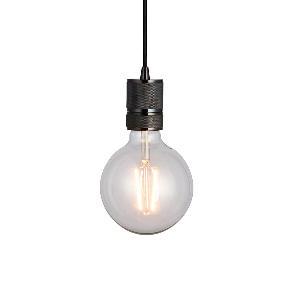 This industrial cable set is finished in smart black chrome plated metal with authentic machined details.Suspended from height adjustable black fabric flex. The perfect carrier for filament LED lamps to create that stylish exposed lamp look.