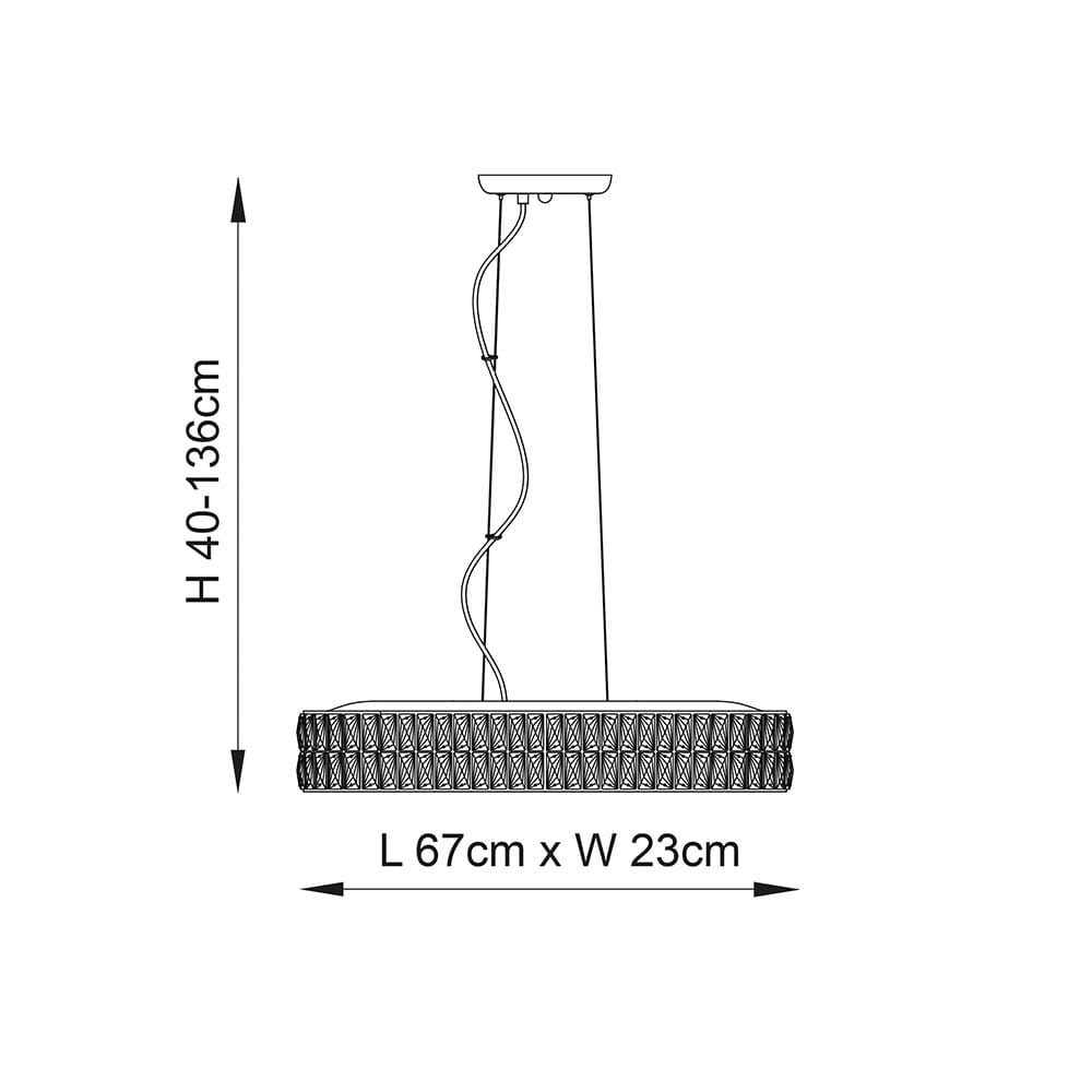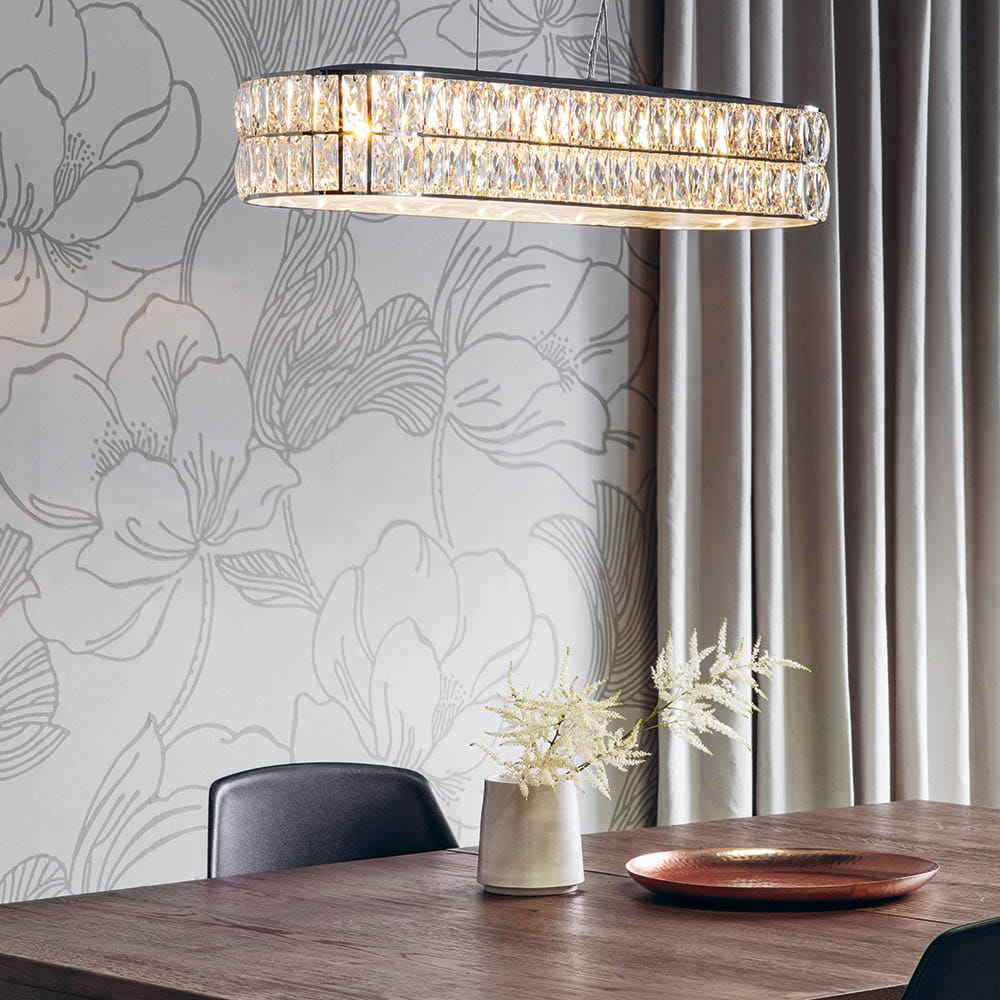 High quality clear crystals adorn this deluxe chrome plated LED contemporary pendant, fully enclosed by a beautiful prismatic glass diffuser.The combination of clear crystals, polished chrome and glass create a luxurious interior decorative light pendant, perfect for positioning over your dining room table. Suspended from thin wire and clear flex with integrated LED light source for bright light output.