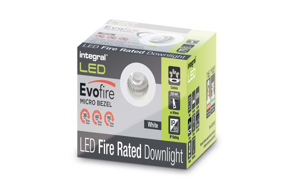 Integral Evofire Micro Bezel Fire Rated Downlight 60Mm Cutout 72Mm Diameter IP65 White Round +Gu10 Holder