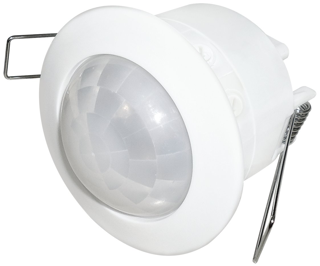Recessed flush mounted white stand alone PIR sensor, 360 degree detection zone with 4 metre detection radius, adjustable lux level and time setting built in. Able to control incandescent loads up to 2000W and LED loads up to 250W