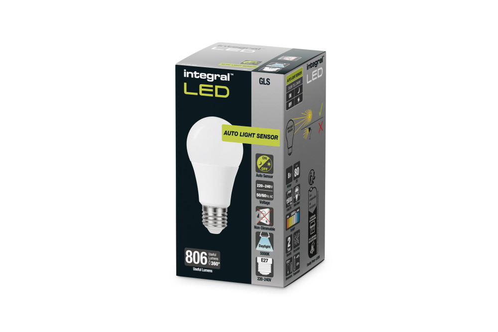 This 8W retro-fit Integral LED Auto Sensor Classic Globe (GLS) (large screw base) delivers a daylight output equivalent to 60W. Because security lighting is on an average of 12 hrs. per day you can save over 30 GBP/44 EUR per bulb, per year on energy. It automatically switches ON at dusk and OFF at dawn, with dual 360 sensors to detect daylight from all angles. Ideal for external porches, walkways, paths and patios. To be used in suitable enclosed outdoor fittings.