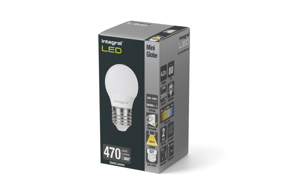This 4.2W retro-fit Integral LED Mini Globe (large screw base) delivers a warm light and brightness, similar to a 40W filament bulb. It features high output, multi Everlight LEDs and an anti-glare refractor. Ideal for living rooms, dining rooms and bedrooms, in classic or modern wall or floor/table lamp fittings.