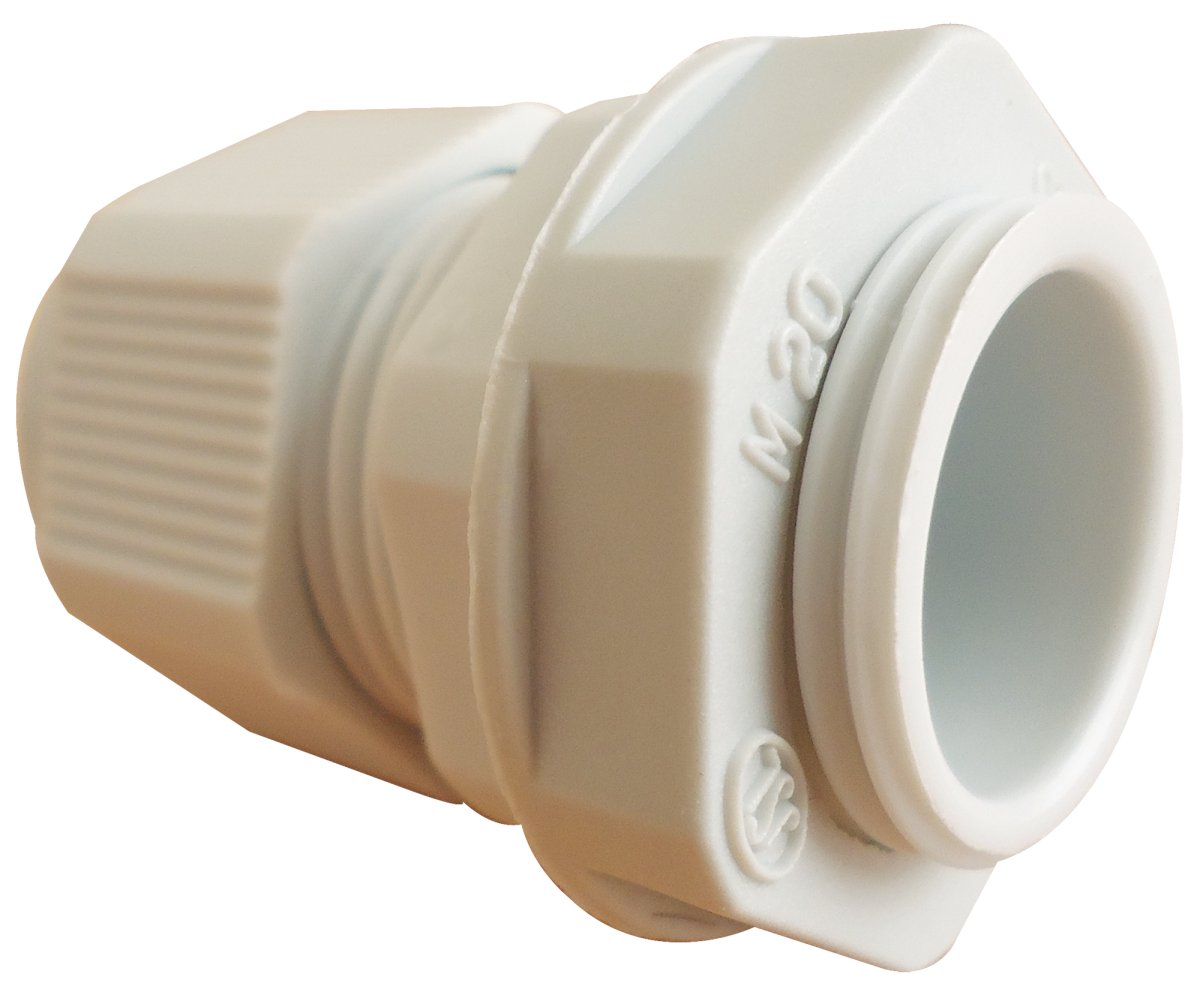 Grey 20mm TRS Cable Gland with Locking Nut, accommodates cables from 8-13mm and fire retardant to 850ºC, suitable for maintaining IP rating sealing around cable entries on a range of applications such as electrical boxes, lighting controls and light fixtures