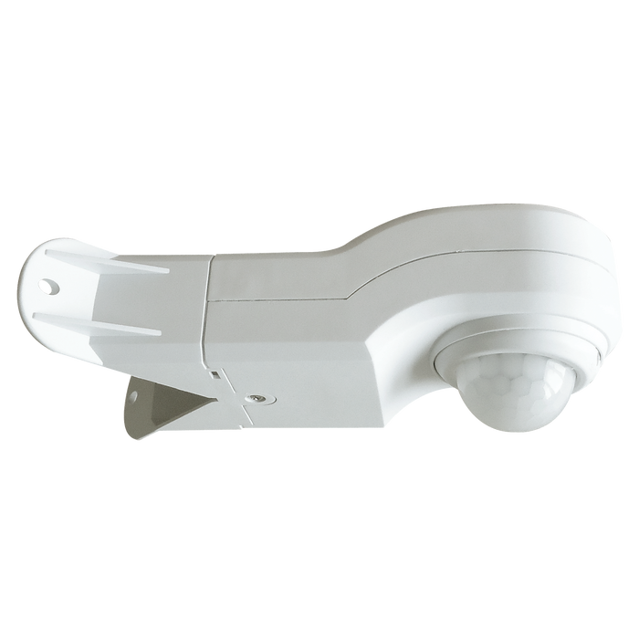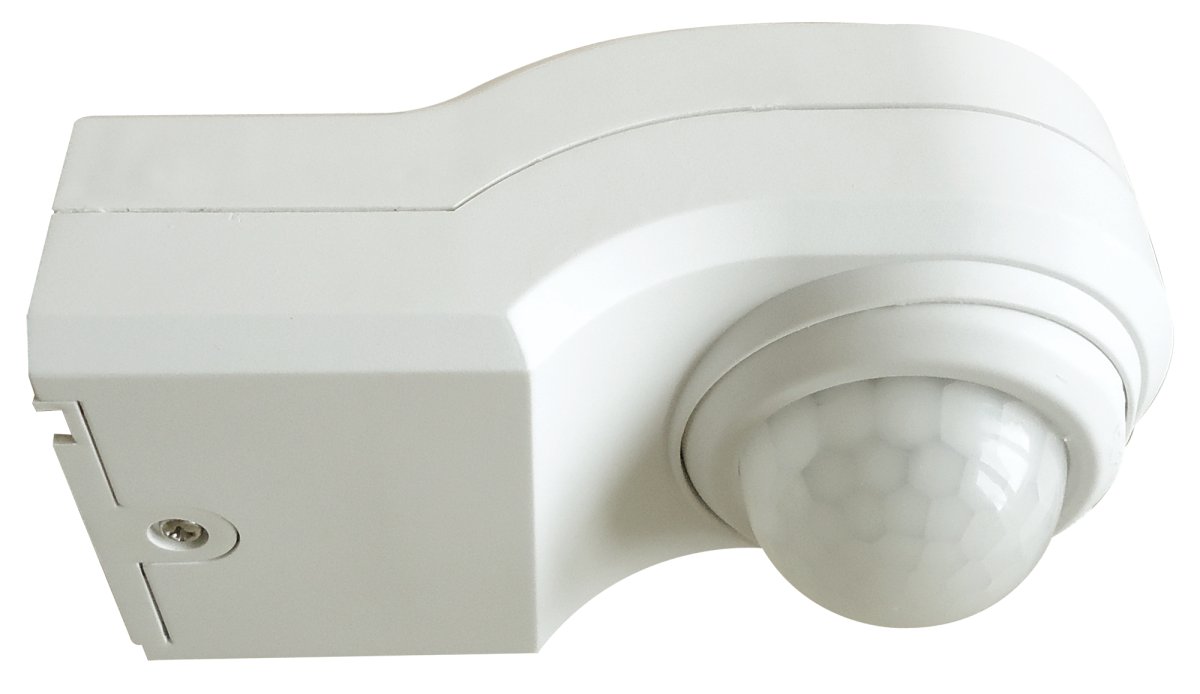 Standalone IP44 external white PIR 360º sensor, vertical and horizontal adjustable PIR head with an optional corner bracket for detection areas around the corner of buildings. The Sensor has a load capacity of 1000W of incandescent lamps and 150W of LED loads, time and lux level adjustable