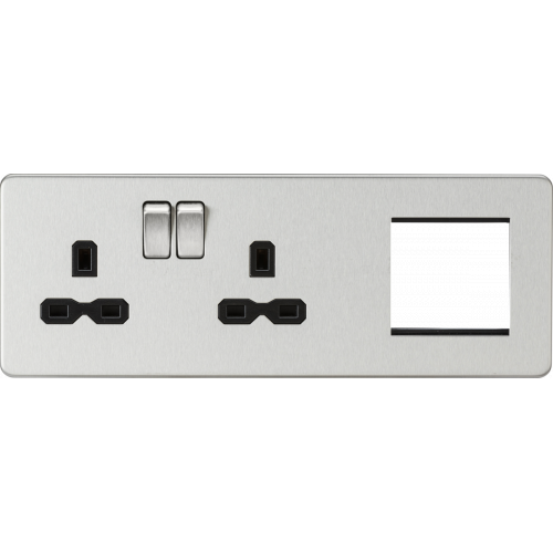 Essential for any major upgrade, renovation or new build. The Screwless Socket and 2G Modular Combination Plate allows for a power and bespoke signal distribution solution to be combined in one area.Compatible with our extensive range of modular inserts this plate can be configured to suit your requirements, be it Satellite TV, DAB, Telecoms, Networking or even USB Charging.Product code explanation: “L” designates 2G Socket on the left and 2G modular on the right “R” designates 2G Socket on the right and 2G modular on the leftFeatures- 230V 13A- Double Pole Switches- 1 x 2G Double Sockets with Twin Earth- Space for up to 2 x Euro module inserts (25 x 50mm)