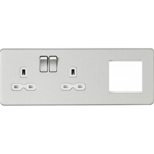 Essential for any major upgrade, renovation or new build. The Screwless Socket and 2G Modular Combination Plate allows for a power and bespoke signal distribution solution to be combined in one area.Compatible with our extensive range of modular inserts this plate can be configured to suit your requirements, be it Satellite TV, DAB, Telecoms, Networking or even USB Charging.Product code explanation: “L” designates 2G Socket on the left and 2G modular on the right “R” designates 2G Socket on the right and 2G modular on the leftFeatures- 230V 13A- Double Pole Switches- 1 x 2G Double Sockets with Twin Earth- Space for up to 2 x Euro module inserts (25 x 50mm)