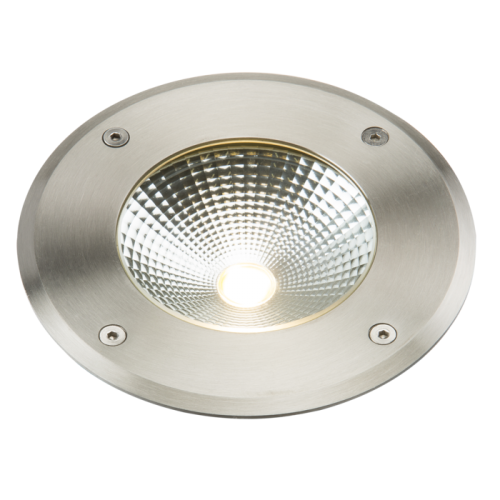 230V IP65 9W 3000K LED Stainless Steel Recessed Ground Light. 304 Stainless Steel bezel aluminium housing and plastic mounting sleeve. Supplied complete with 2 mtr outdoor flex. AC-LED COB non-dimmable. Ideal for driveways, low surface temperature, safe for use indoor and outdoor. Low energy, low maintenance, long life. Suitable for drive over (max 5mph 800kg) when used in conjunction with sleeve in tarmac or concrete.