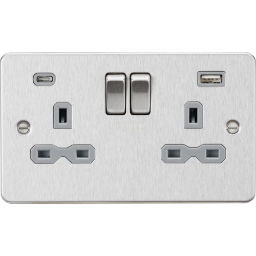 Knightsbridge Flat Plate Brushed Chrome 13A 2G SP Switched Socket with Dual USB A+C (5V DC 4.0A shared) Grey Insert
