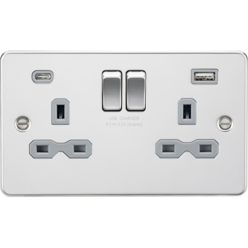 Knightsbridge Flat Plate Polished Chrome 13A 2G SP Switched Socket with Dual USB A+C (5V DC 4.0A shared) Grey Insert