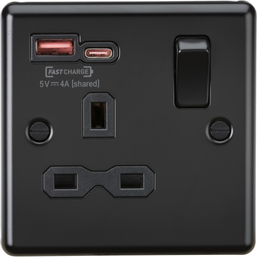 These metal decorative rounded edge USB charging sockets output at a Max. 18W over either port, they are ideal for location where you might want a fast charge. They come with the latest USB-C port for the latest equipment and a legacy USB-A port for charging older devices. They intelligently switch the voltage to give your device what it needs. Ideal for homes, offices, home offices, coffee shops, bars, restaurants, hospitality areas or anywhere a convenient FASTCHARGE might be needed.Supports USB-PD – a recognized standard for charging devices using a USB connection. To take advantage of this your device must support USB-PD. Also supported is the older QC standard over USB-A which is found on Qualcomm-based devices. 13A 230V 50Hz Single Pole Twin Earth Dual USB A+C Voltage Switching technology up to 12V DC 1.5A. Max. 18W Delivering up to 18W over either port enough to fast charge a smartphone Continues to deliver when both ports are in use Max. 20W shared Over Voltage CAT III – suitable for domestic and commercial installationsNB: We recommend you only use certified USB cables for safety and to ensure compatibility, it is also important to ensure your USB can handle the power output most USB cables are only rated to 30W, some to 60W we recommend only using 30W+ rated cables with this device.