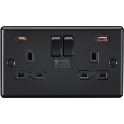 These metal decorative rounded edge USB charging sockets output at a Max. 45W over the USB-C port, they are ideal for location where you might want a fast charge. They come with the latest USB-C port for the latest equipment and a legacy USB-A port for charging older devices. They intelligently switch the voltage to give your device what it needs. Ideal for homes, offices, home offices, coffee shops, bars, restaurants, hospitality areas or anywhere a convenient FASTCHARGE might be needed.Supports USB-PD – a recognized standard for charging devices using a USB connection. To take advantage of this your device must support USB-PD. Also supported is the older QC standard over USB-A which is found on Qualcomm-based devices. 13A 230V 50Hz Double Pole Twin Earth Dual USB A+C Voltage Switching technology up to 20V DC 2.25A. Max. 45W Delivering up to 45W over USB-C -enough to power tablets and small laptops Dual Fast Charge – continues to deliver when both ports are in use giving up to 27W over USB-C and 18W over USB-A Over Voltage CAT III – suitable for domestic and commercial installations Built-in Overload, Overheat and Over Current ProtectionNB: We recommend you only use certified USB cables for safety and to ensure compatibility, it is also important to ensure your USB can handle the power output most cheap USB cables are only rated to 30W, some to 60W we recommend only using 60W+ rated cables with this device.