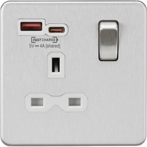 Knightsbridge Screwless Brushed Chrome 13A 1G SP Switched Socket with Dual USB A+C 12V DC 1.5A [Max. 18W] White Insert
