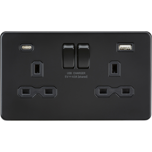 Knightsbridge Screwless Matt Black 13A 2G SP Switched Socket with Dual USB A+C (5V DC 4.0A shared) Black Insert