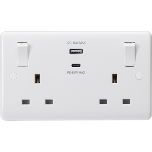 Knightsbridge White Curved Edge 13A 2G SP Switched Socket with Dual USB A+C 20V DC 2.25A (Max. 45W) with Outboard Rockers