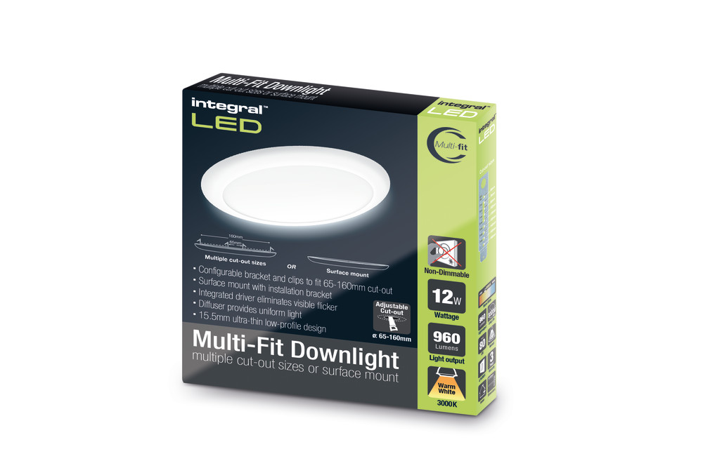 Integral Multi-Fit Downlight 65-160Mm Cutout 960Lm 12W 3000K Non-Dimm 80Lm/W White Tpb Diffuser