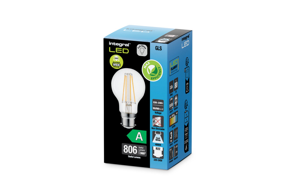 Integral Omni Filament Gls Bulb B22 806Lm 3.8W 4000K 212Lm/W Class A Non-Dimmable 320 Beam Clear Full Glass