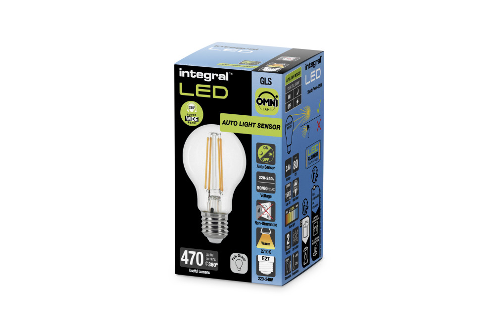 The 3.6W Integral LED Auto Sensor Filament Bulb has a classic style and premium appearance and offers outstanding energy saving potential. The fully glass globe (GLS) construction and strands of LED chips replicating filaments provide a traditional look and feel which will add a luxurious touch to your outdoor lighting set-up. Offered in warm white light (2700K), the bulb provides a subtle warmth to illuminate your way. With dual sensors allowing 360° daylight detection, the integrated dusk to dawn sensor automatically switches the light ON at dusk and OFF at dawn, ensuring the lamp is never on for longer than it needs to be. With security lighting being on for an average of 12 hours a day, you can save over 50 GBP/45 EUR per year by switching from a conventional 40W halogen bulb. Ideal for external porches, walkways, paths, and patios. To be used in a suitable enclosed outdoor large screw base fitting.