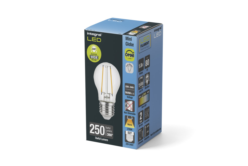 This cutting edge 1.8W retro-fit Integral LED Mini Globe (large screw base) from the Omni-Lamp range delivers a warm white light and brightness, similar to a 25W filament bulb. It has the appearance, feel and weight of a traditional light bulb. Featuring an LED filament, which enables a super-wide 320 degree beam angle. A decorative lamp ideal for living rooms, dining rooms, bedrooms and hotels, in classic or modern wall or floor/table lamp fittings.