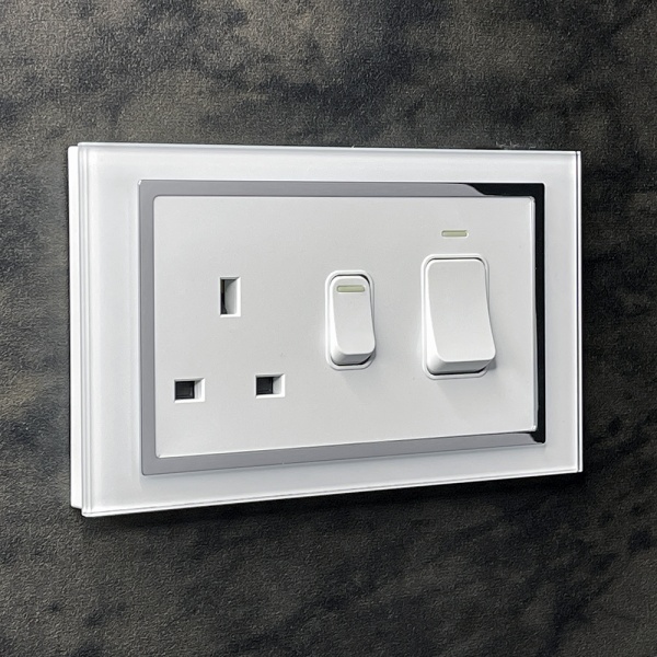 Upgrade your kitchen with the White Crystal Cooker & Socket, featuring a sleek screwless glass faceplate for a modern touch. Combining a 45A cooker switch and a single socket, this elegant unit is perfect for placement near your cooker. Designed to complement Retrotouchs Crystal light switch range and plug socket, it offers a seamless and stylish finish.