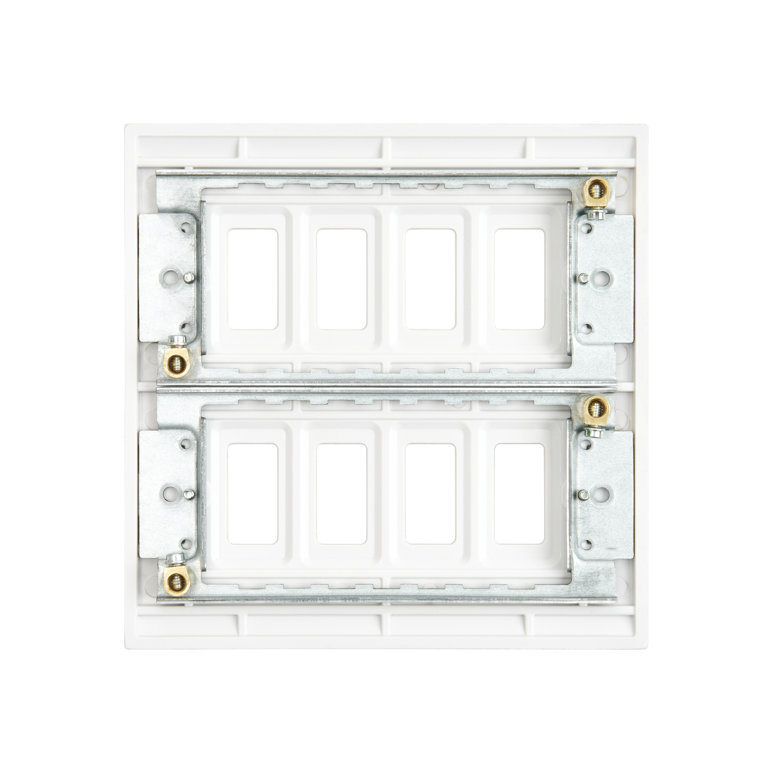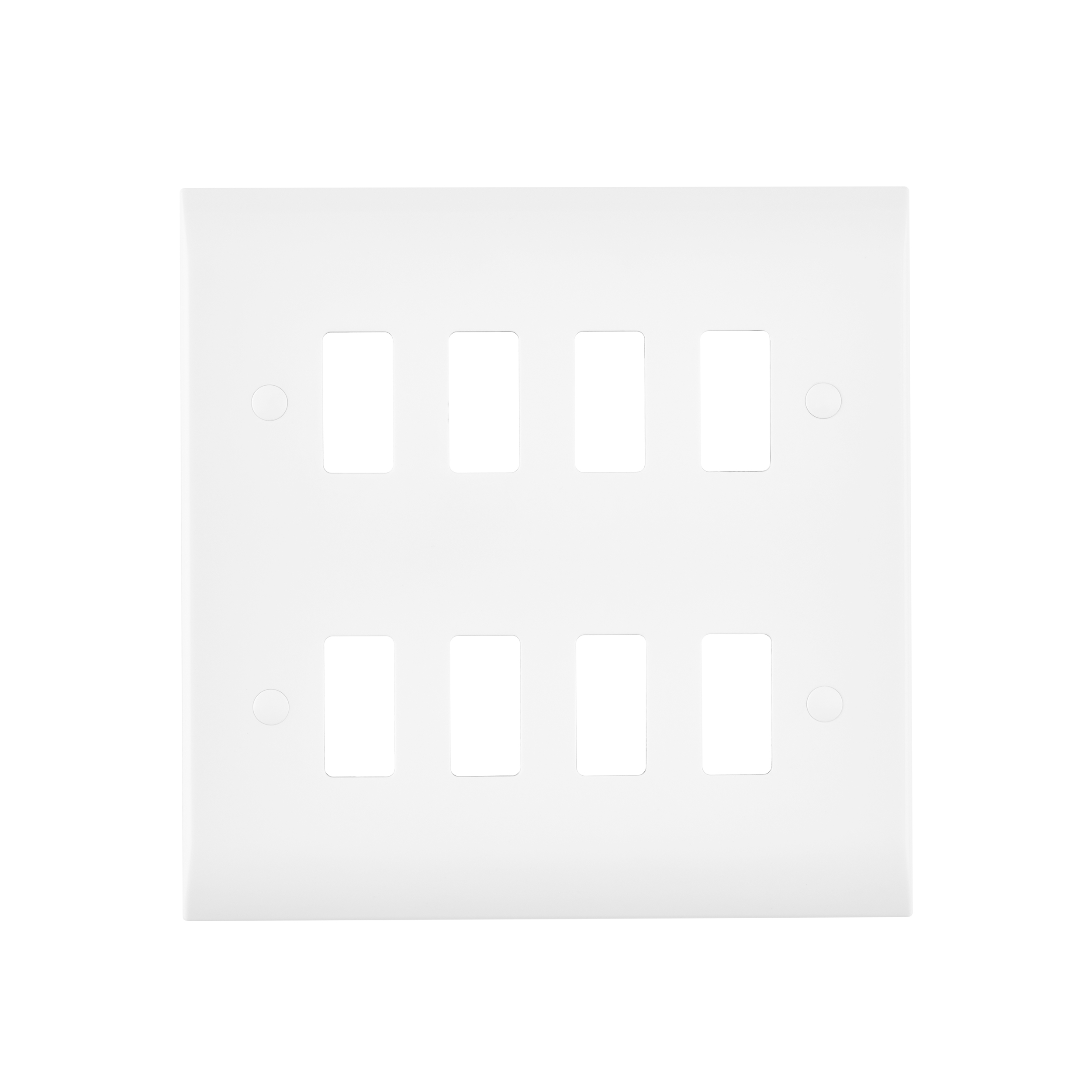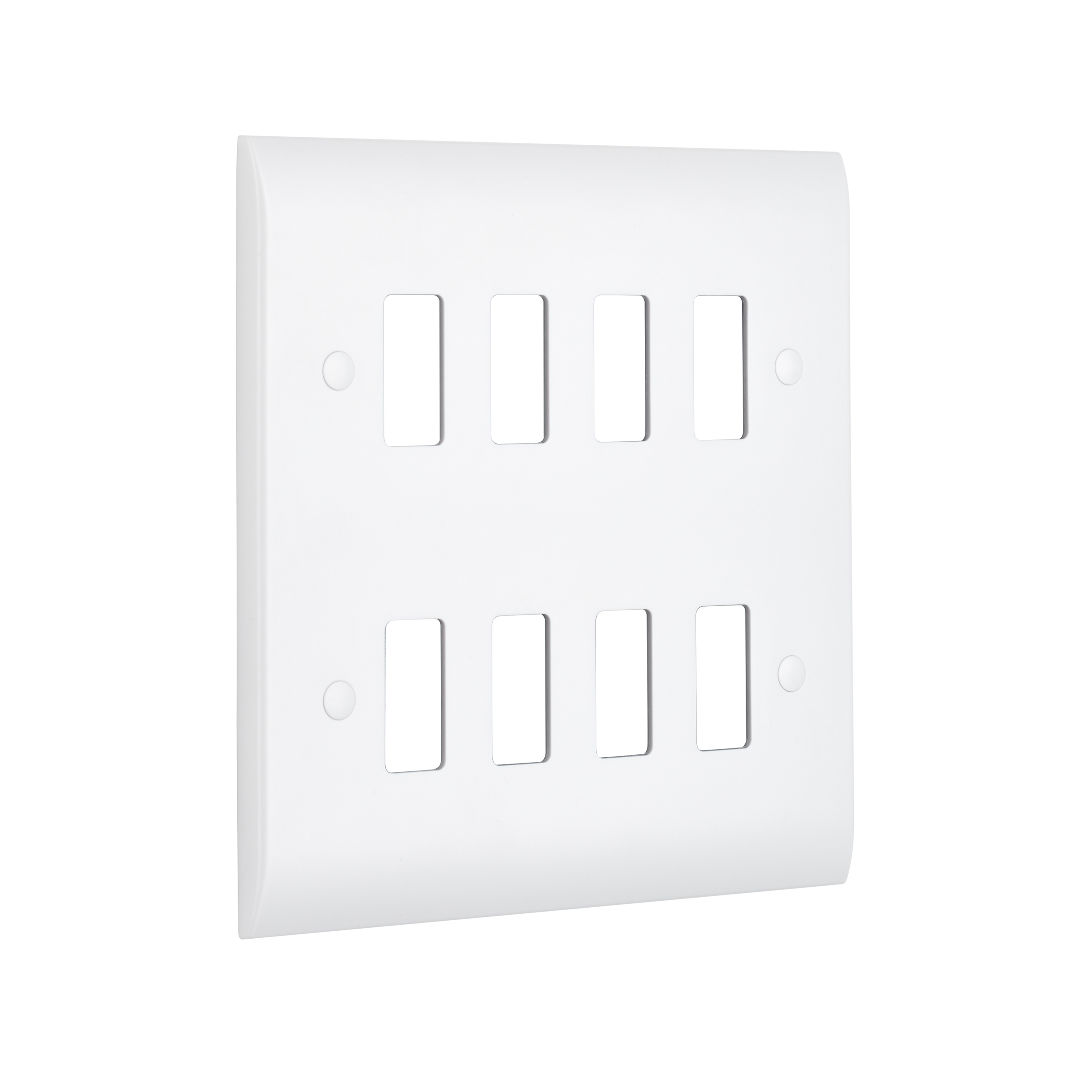 Yolk supplied with every grid plate as standard allowing for quick, easy and hassle free installation. Supplied with fixing screws & white screw covers to conceal fixing screws for sleek appearance. No visible plastic around the rockers. This has been manufactured using high grade thermoset Urea. This plate accommodates 8 modules.