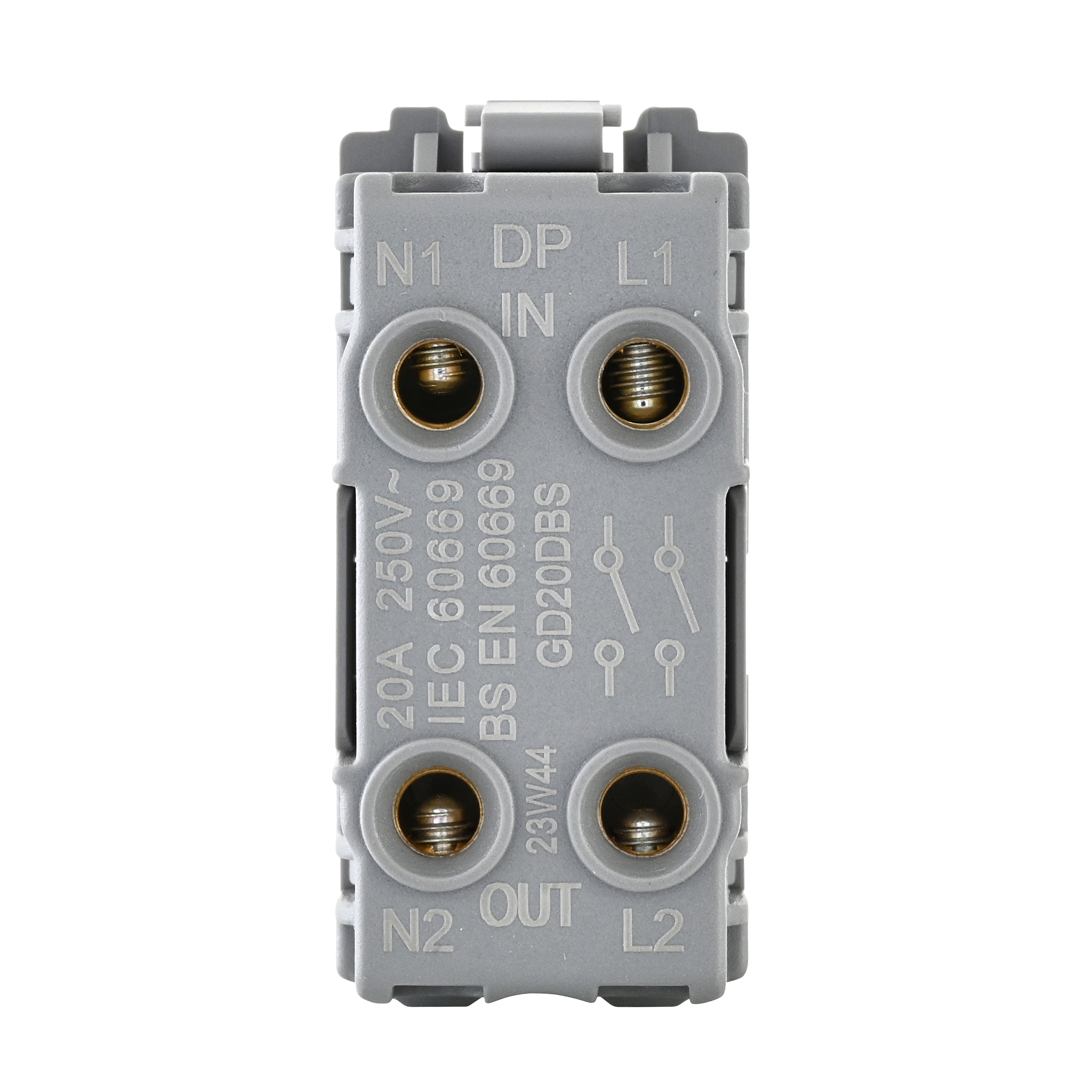 This module is rated to 20A. Easily clips into any Saxby Electrical grid plates. 2 way switching allows for a secondary switch position in the circuit. Double pole switching for the peace of mind of a safer installation. Other colour finishes available.