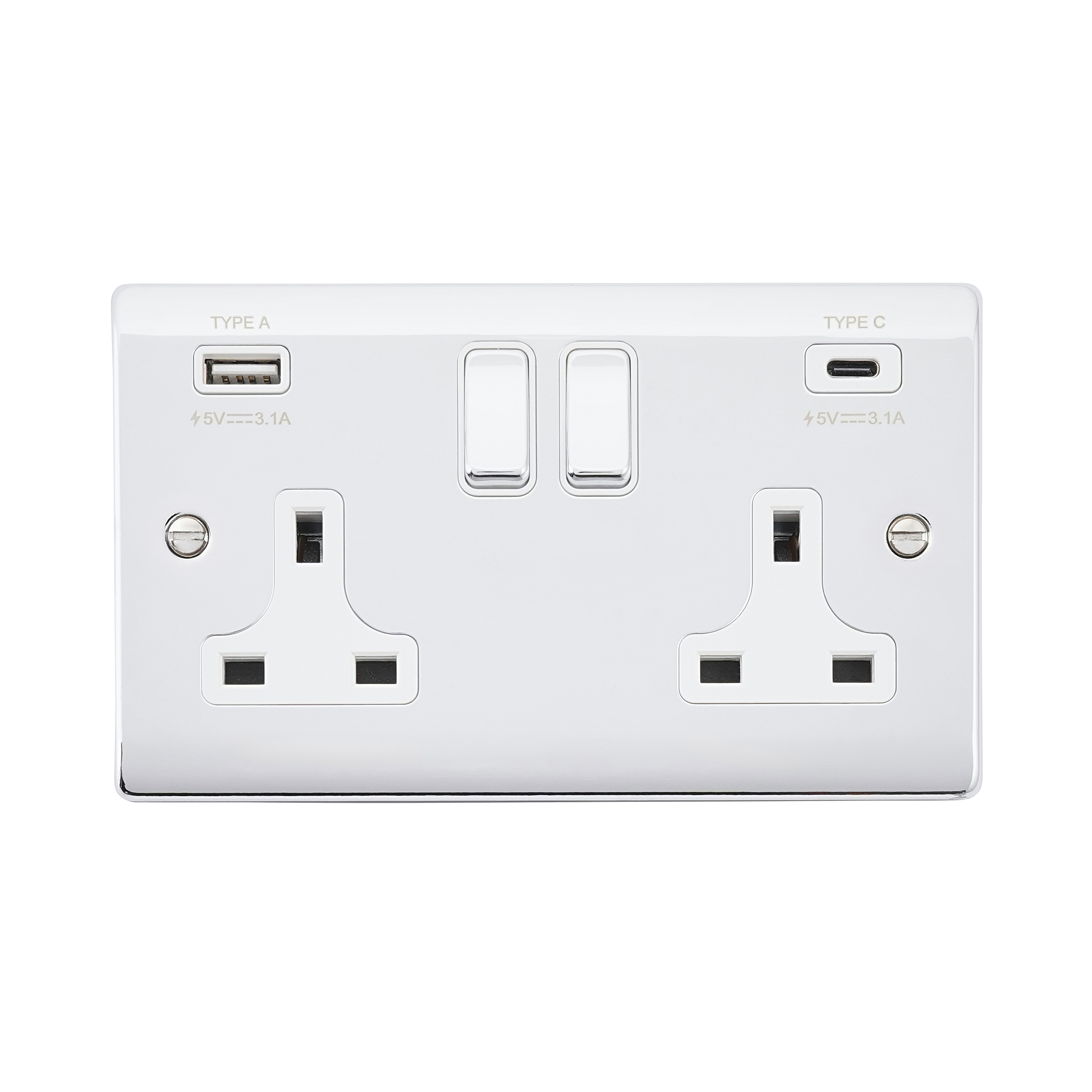 Saxby Electrical Raised Screwed 13A 2G DP Socket 15.5W USB A+C Polished Chrome