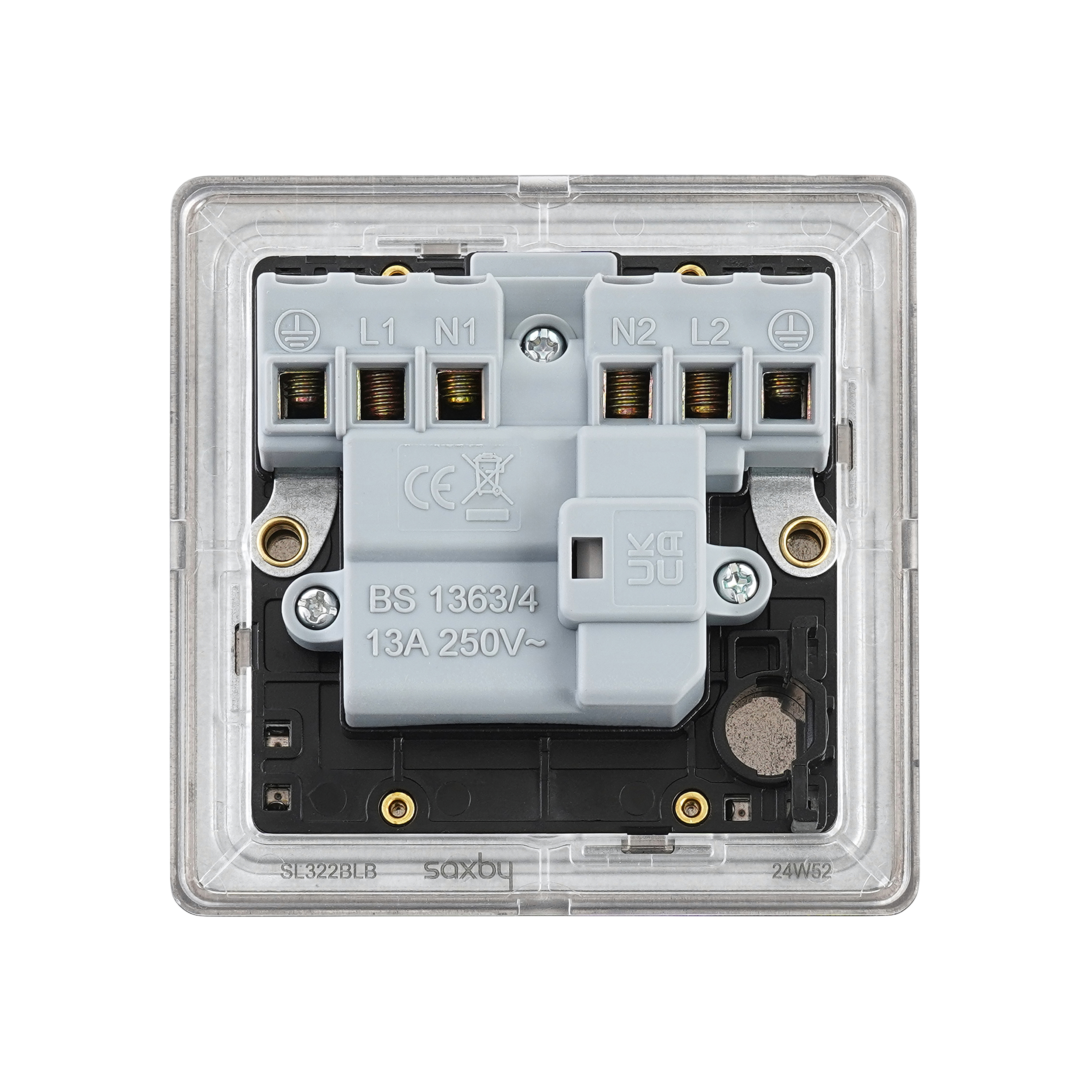 Our 13A rated fuse spur socket boasts angled in-line terminals with captive screws which provide for quick and easy access and a hassle free installation. Supplied with fixing screws. Flush neon power indicator on faceplate. Moisture gasket as standard to help prevent any moisture transfer to decorative front plate. The faceplate clips on and off easily due to the four locking points on the rear of the plate making for secure fit.