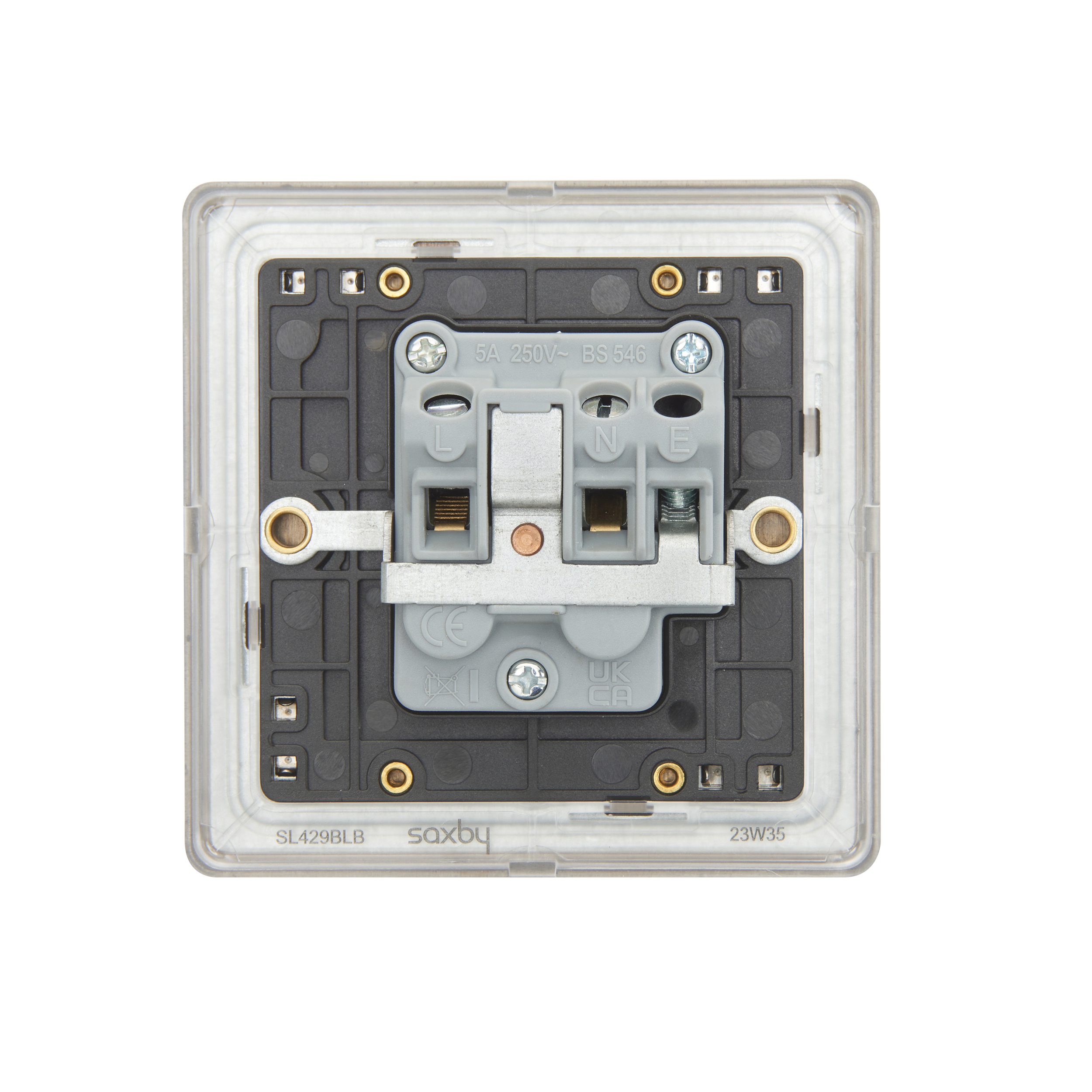 Our 5A rated socket boasts angled in-line terminals with captive screws which provide for quick and easy access and a hassle free installation. Supplied with fixing screws. Moisture gasket as standard to help prevent any moisture transfer to decorative front plate. The faceplate clips on and off easily due to the four locking points on the rear of the plate making for secure fit. We recommend a minimum mounting box depth of 25mm.