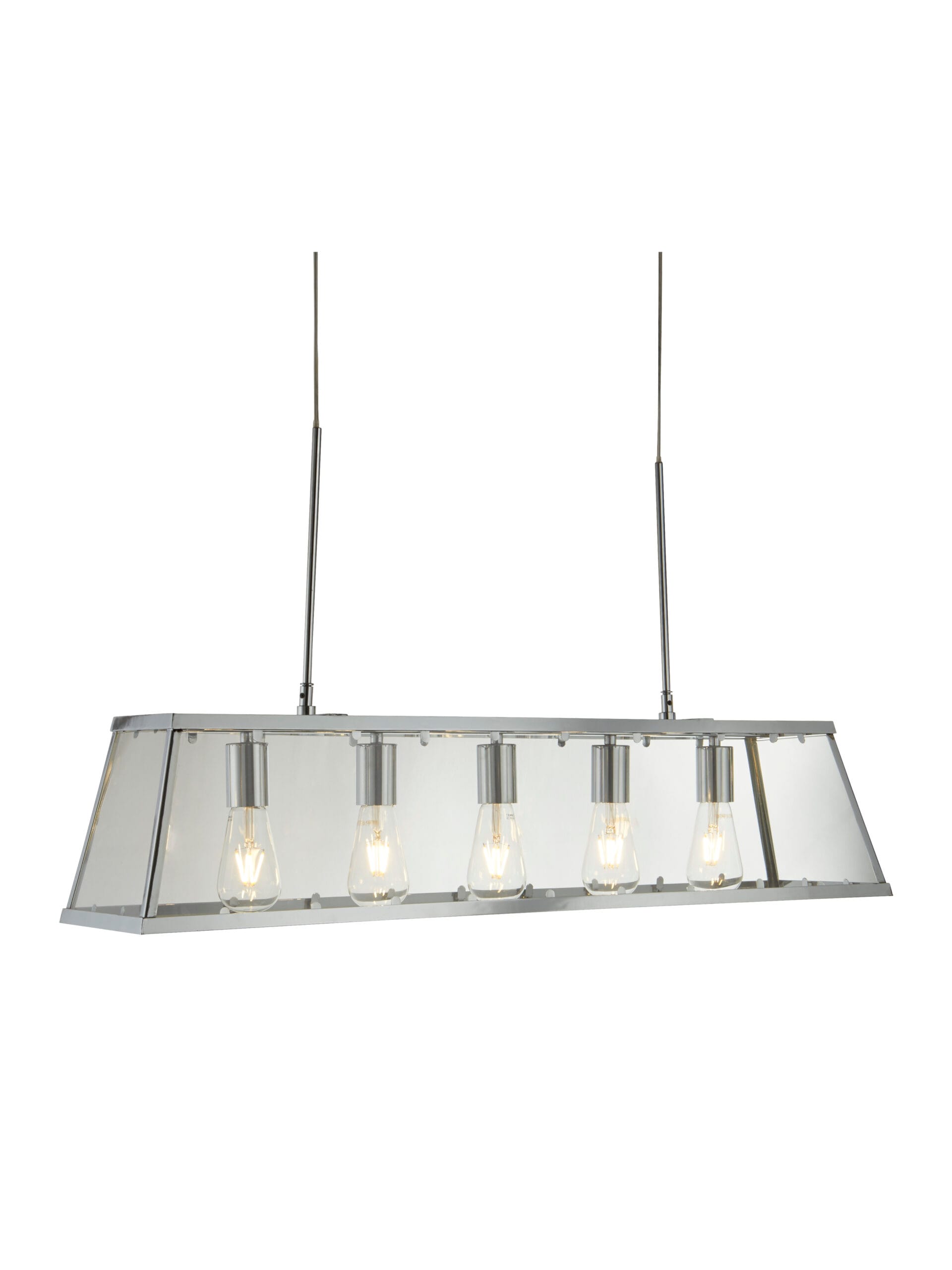 The Voyager clear glass bar pendant has a modern urban feel to it, and would be a welcome addition to any home. Exposed lamps create a modern edge and will ensure the item stands out; whereas the sleek chrome finish prism shaped frame creates a timeless appeal. Add to any contemporary lounge or hallway or hang low via the height adjustable suspension in any dining room or kitchen diner. This pendant can also fully convert to a flush creating a 2-in-1 product.