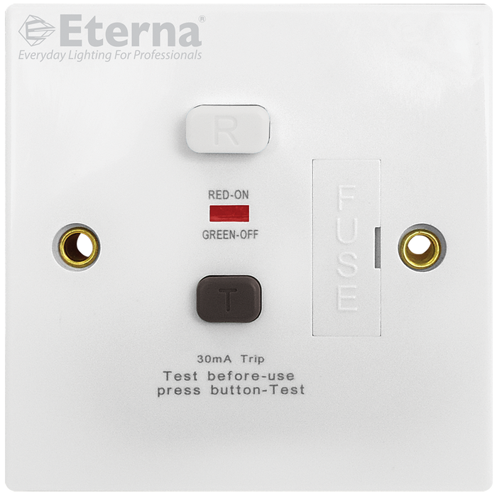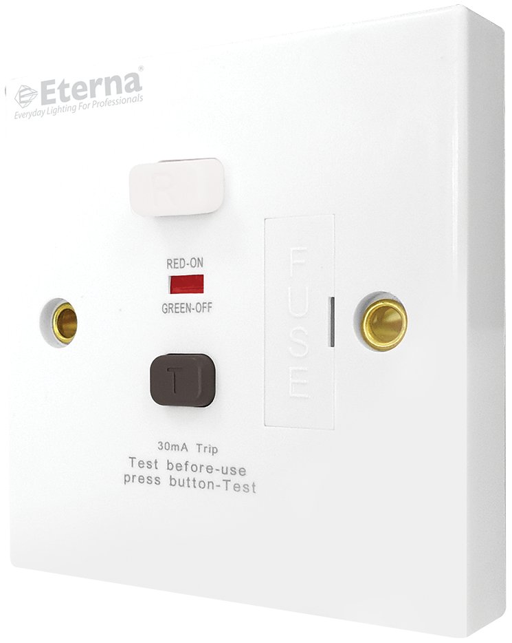 Single unswitched white type A rated RCD socket to ensure tripping for residual AC and pulsating DC currents. Simple to install, fused RCD spur, perfect for electrical protection of permanently installed products such as refrigeration units and hand dryers