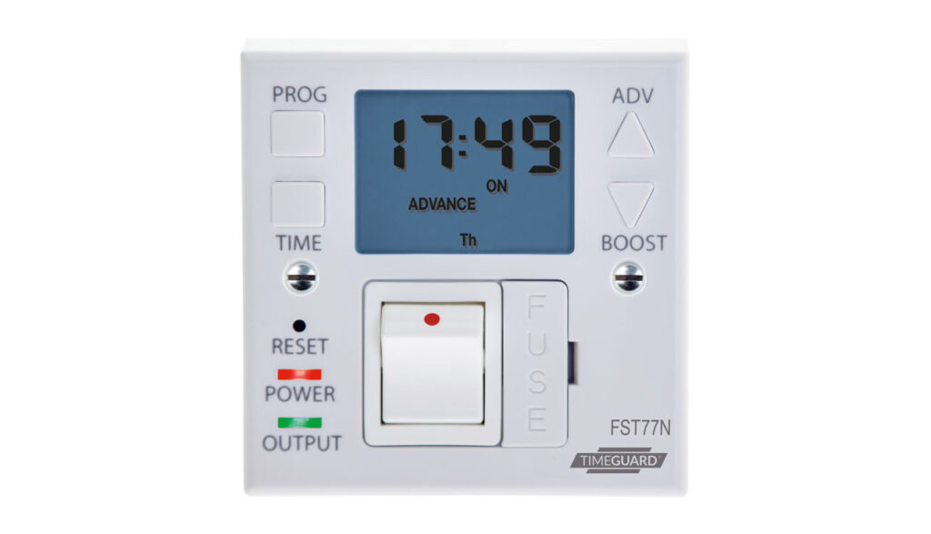 FST77N is a timer switch designed for dependable everyday use in homes and commercial spaces. Key details include Red LED Mains ON and green LED Output indicators, Easy view 24 hour digital clock/timer display, Up to 8 ON and OFF programmes available, Permanent ON/ OFF function, and Boost option. The specification covers up to 24 hours. The build focuses on practical installation and consistent, low maintenance performance.